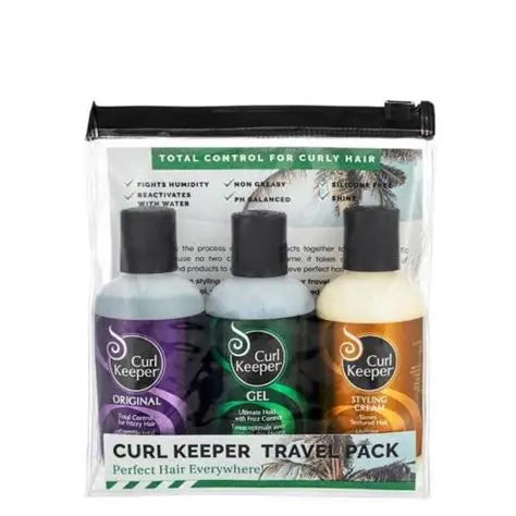 The Curl Keeper® Travel Pack includes travel-size Original Liquid Styler, Gel & Styling Cream—perfect for frizz-free curls on the go.