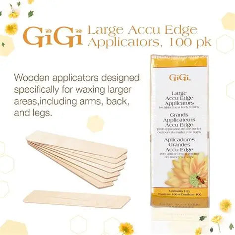 GiGi Large Accu Edge Applicators (100 ct) are wooden spatulas with a precision-angled edge designed for clean, controlled wax application on large body areas, reducing mess. Sanitary and disposable for professional use.